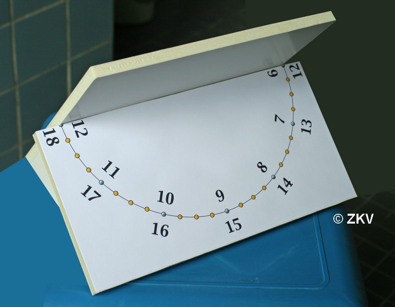 | This model is an equatorial sundial: the table on which numbers are written is parallel to the equator. The back face is perpendicular to it. Its left and right edges act as the styles. The half circle goes up to the start points of the styles. The difference between the hours are 30° and not 360°/24 as one could have expected. |