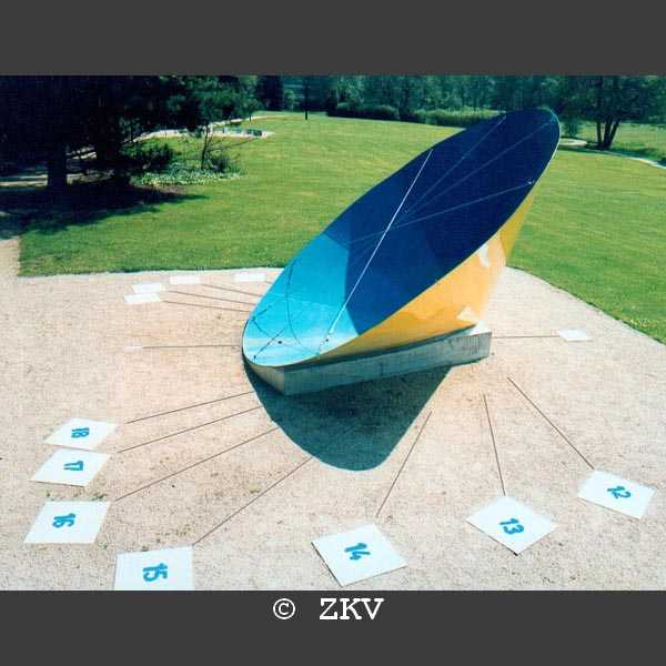 Of course its orientation is subtil with a 51° half-angle (the local latitude) on the top. It is looking toward the North. The hour lines are those of a traditional horizontal sundial with to be honest other values of time.
