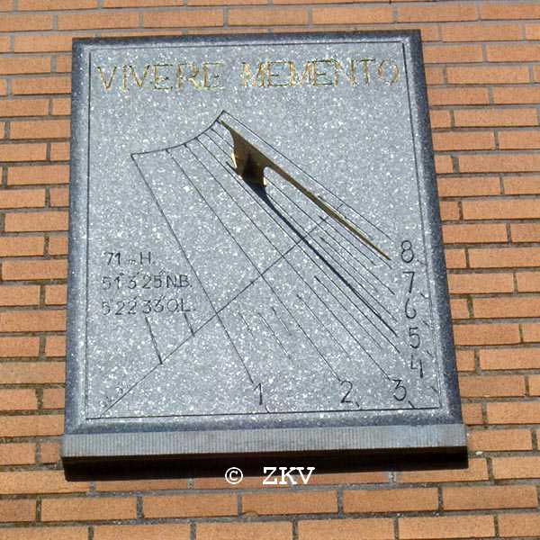 A non used window of the facade has been hidden behind a sundial. The wall is almost facing to the West, which eplains why the time lines are almost parallel to one another and to the style.