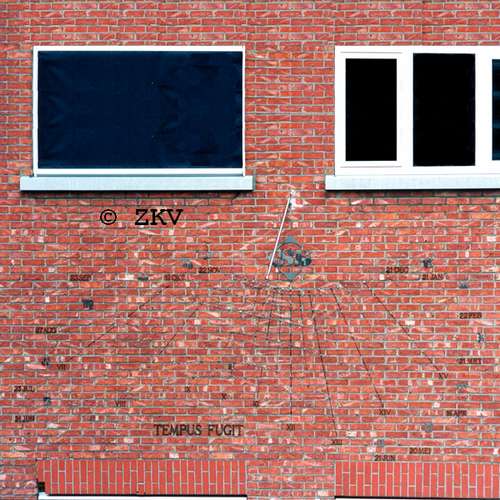 Willy Ory has made a smaller copy of this sundial in his backyard. His dial table is white which highlights it. As far as the sundial in the college is concerned, there is too little contrast between the (too thin) lines and the (too small) numbers and letters on one hand and the brick wall on the other hand.