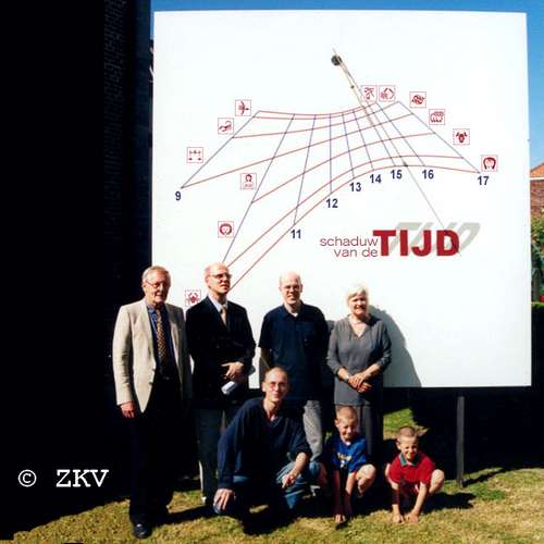 Willy Leenders, author of this sundial and maker of the exhibition, is posing with his wife, sons and grandsons in front of the sundial.