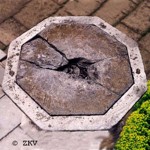 This sundial is completely ravaged. Even the style is missing. On the slate table one can merely see the lines and the numbers. The pedestal is still in a good state.