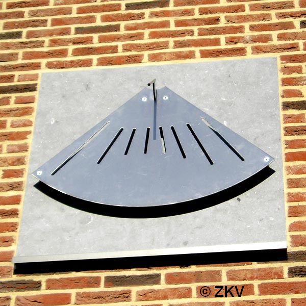 This stainless steel sundial is nice with its sober form. The wall where it is located makes a 3° angle with the South. Due to some inaccuracies it is more a facade ornament than a sundial.