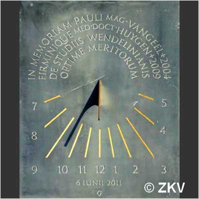 Motto : IN MEMORIAM PAULI MAG(ISTRI) VANGEEL + 2004 / FIRMINIQUE MED(ICI) DOCT(ORI) HUYGEN + 2009 / DE STUDIIS WENDELINIANIS OPTIME MERITORUM / 6 JUNII 2011