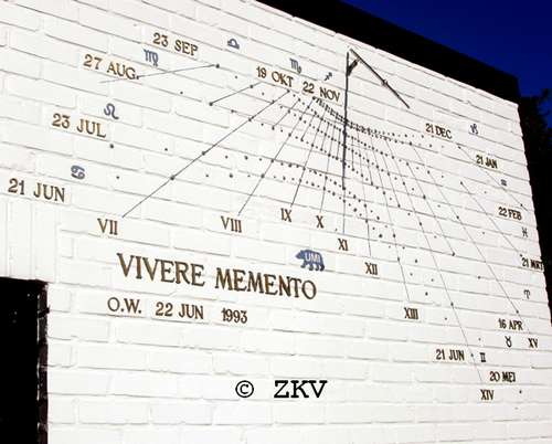 En plus de l’heure, ce cadran indique également la date. Une petite boule sur le style projette son ombre sur le mur. Lorsque l’on relie les points sur les lignes horaires on obtient les dates de début des signes zodiacaux. L’endroit où l’ombre de la boule se projette indique depuis combien de temps le Soleil se situe dans le signe.