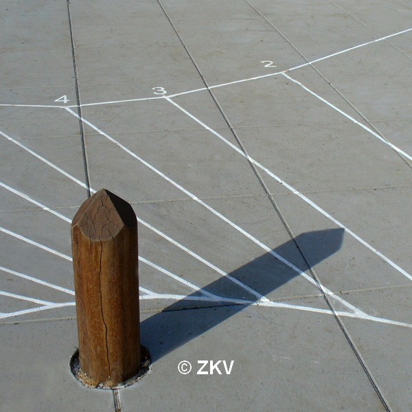 La courbe près du pieu (voir détails sur la photo) représente l'endroit où l'ombre du pieu tombre du matin au soir au début de l'été, environ le 21 juin. L'autre courbe sert lors du début de l'hiver (environ le 21 décembre).