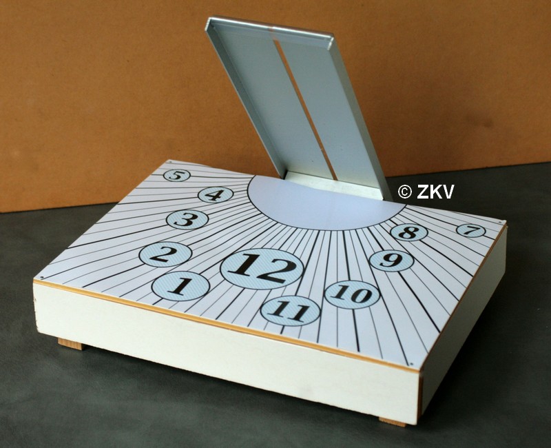 Dit is een horizontale zonnewijzer waarbij de poolstijl vervangen is door een spleet tussen twee metalen profielen.