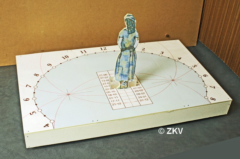 Dit is een analemmatische zonnewijzer of zonnewijzer waarin de mens betrokken wordt. De afleespunten staan op een ellips. In het midden is een rechthoekig paneel met datum aanduidingen. Als een persoon tegenover de juiste datum staat geeft zijn schaduw het uur weer.