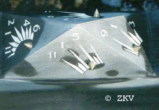 Op elk vlak van de kleine piramide ingewerkt in de bovenkant van de grafsteen staat een puntzonnewijzer. Het uur wordt afgelezen op de schauw van de punt van de kegelvormige stijltjes die loodrecht op het vlak met de uurlijnen staat.