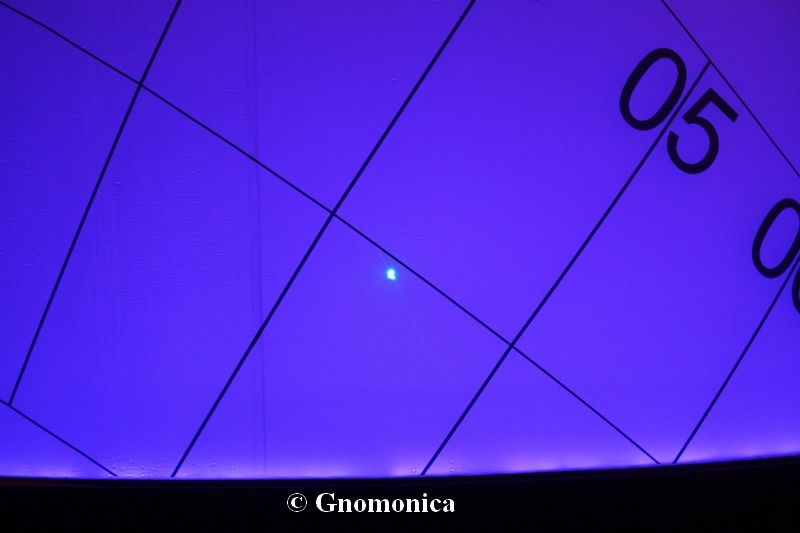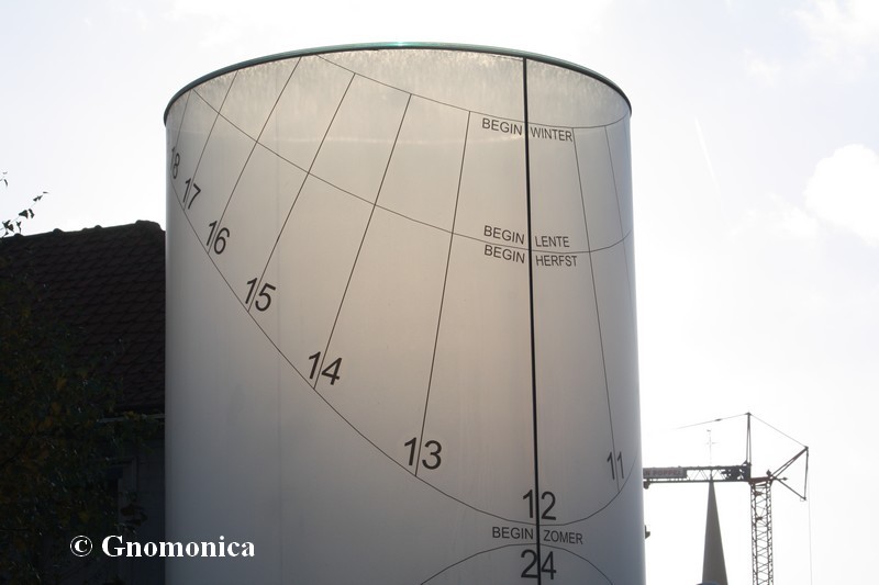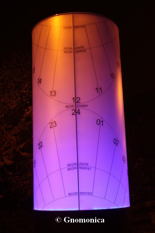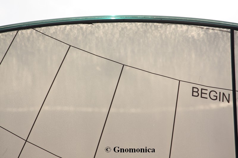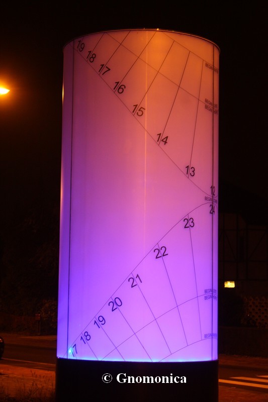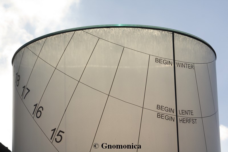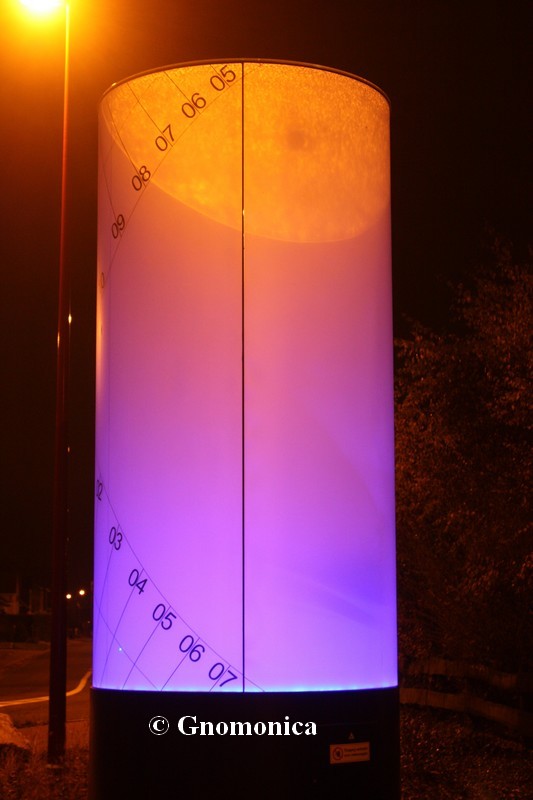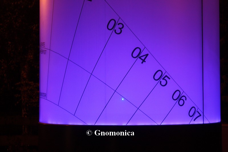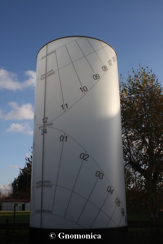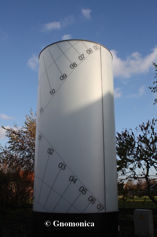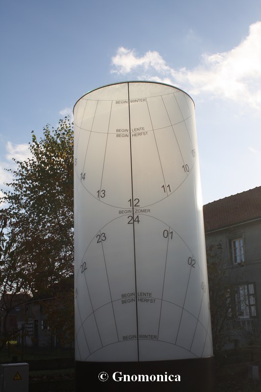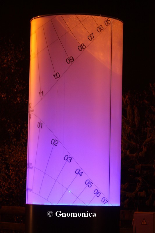 The sundial is made of a 3,60m high cylinder, with a diameter equal to 1,80m. It is set up on a 1m high metal base. The shadow of a 10cm bowl is projected inside the cylinder and is visible outside due to the fact it is made of frosted glass. This shadow indicates the time as well as the date. There are hour lines for each entire hour and date lines for the beginning of each season. The time shown is the local solar time.