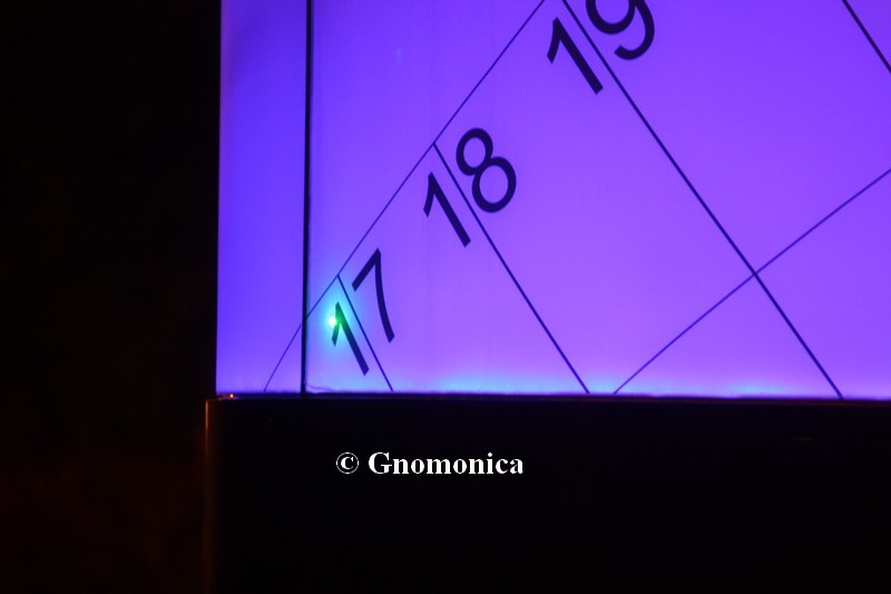 From sunset to sunrise, a programmed laser beam creates a spot to indicate the time from the soil.