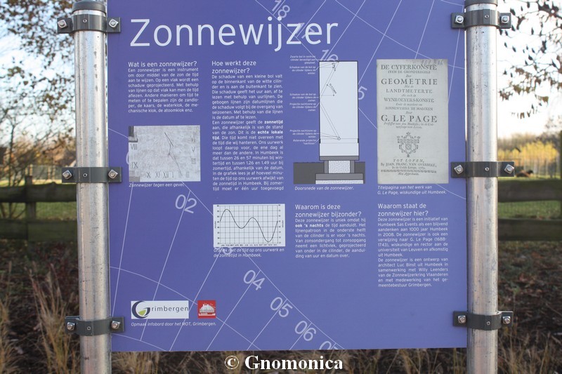 The sundial has been set up from an initiative of André Lombaerts (Humbeek Sas Events) to celebrate the Humbeek millennium, as well as for William Le Page (Humbeek 1688). Le Page was priest and mathematician. He became professor of the university of Leuven, he has written a book in 1760about sundials making.