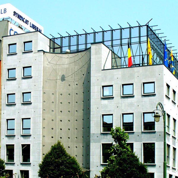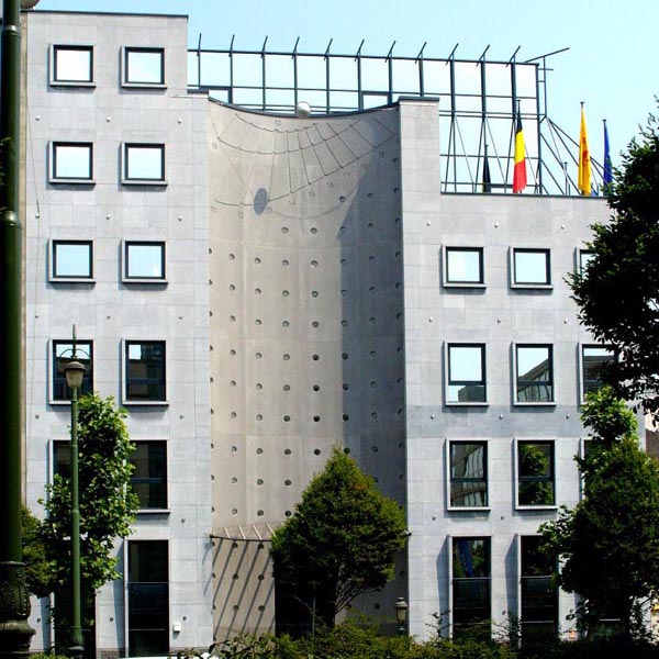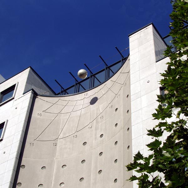 The façade of the building, which is more or less facing south-west, is made of three parts: the left and right parts are flat while then central part is half of a cylinder. Inside this hollow part, the fourth of a cylinder, resides a sundial. It is about 6,5m broad and 3,3m high and covers the fifth to the sixth floor. A bowl generates the shadow.