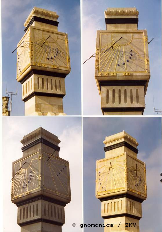 Il y a un cadran sur chacune des quatres faces verticales du bloc gnomonique de la cheminée du bâtiment (à peu près SO, SE, NE et NO à 35 m de hauteur).