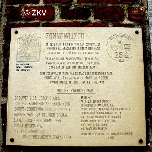 Ce cadran fut offert en 1991 à la ville de Bree par le Prince Vital I (Vitalus Primus) et ses adjudants Marc et Roger du groupe carnavalesque 'De kwaartjeslummels'