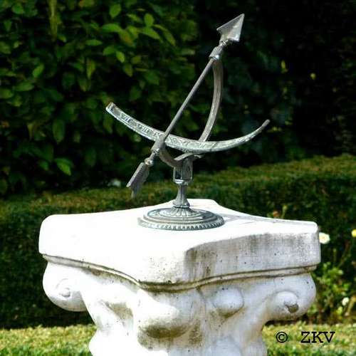 Ce cadran de série est placé sur un socle gracieux dans un jardin.