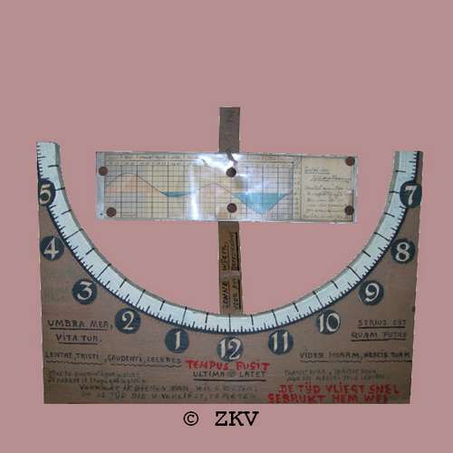 Devise : Omnes vulnerant, ultima necat / Umbra mea, vita tua / Lentae, tristi, gaudenti, celeres / Tempus fugit, ultima latet / Serius est quam putas / Vides horam, nescis tuam / Transit hora, transit pena, non sic merces ipsa laboris / Veux tu savoir à qoi que je sers, je marque le temps que tu perds / De tijd vliegt snel gebruikt hem wel