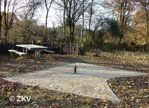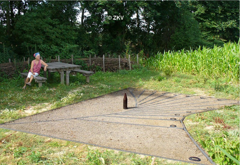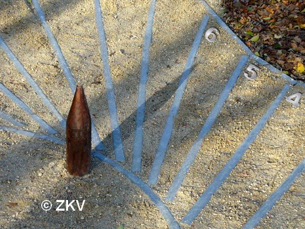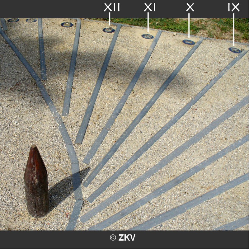 La courbe près du pieu (voir détails sur la photo) représente l'endroit où l'ombre du pieu tombre du matin au soir au début de l'été, environ le 21 juin. L'autre courbe sert lors du début de l'hiver (environ le 21 décembre).