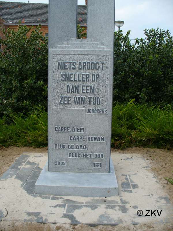 Devise : NIETS DROOGT SNELLER OP DAN EEN ZEE VAN TIJD / CARPE DIEM CARPE HORAM / PLUK DE DAG PLUK HET UUR / TEMPUS NEMINEM MANET