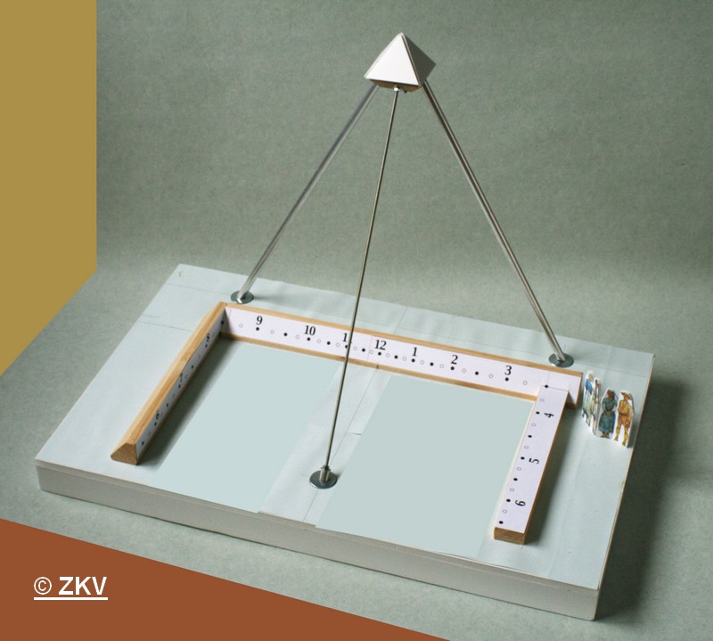 Dit is een horizontale zonnewijzer waarbij de drie zijden van de rechthoek met de uren verschillend zijn: verticaal, schuin en horizontaal.