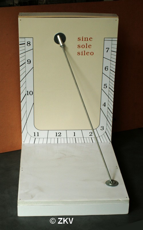 Dit model is een verticale zonnewijzer die naar het zuid-westen gericht is..