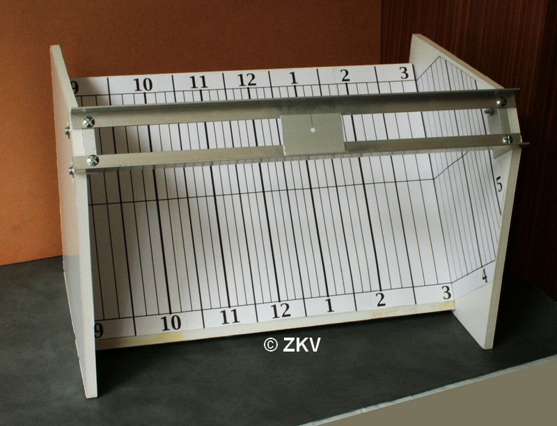 | Bij deze zonnewijzer verdwijnt de poolstijl volledig en wordt feitelijk vervat in de uurlijnen die alle evenwijdig zijn met de as van de aarde. |