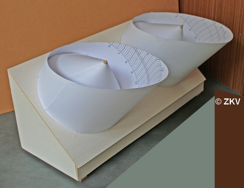 De as van de cilinder is evenwijdig met de aan de as van de aarde. De cilinder is bovenaan horizontaal afgesneden. Binnenin de cilinder staat een kegel waarvan de top juist in het middenkomt van de elliptische afsnijding van de cilinder.