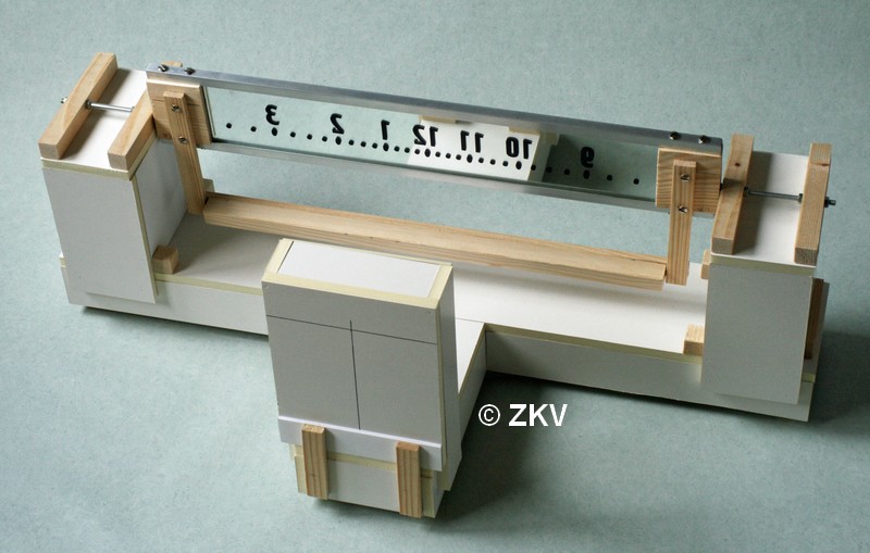 Op een langwerpige spiegel zijn de uren aangebracht in spiegelbeeld met er onder volgens een horizontale lijn cirkeltjes die een onderverdeling per 15 minuten geven. De onderlinge afstanden van deze cirkeltjes zijn ongelijk en worden groter naar de uiteinden toe. De langwerpige spiegel is wentelbaar rond een horizontale as. Tegenover de spiegel is een wit vlak voorzien van een verticale lijn in het midden en iets onder de bovenrand een horizontale lijn. De opstelling is zodanig dat de spiegel die O-W gericht is ook naar het zuiden kijkt. Om het uur af te lezen moet de spiegel gewenteld worden totdat het midden van de cirkeltjes overeenkomt met de horizontale lijn. Alleen dan is de aflezing van de tijd exact.