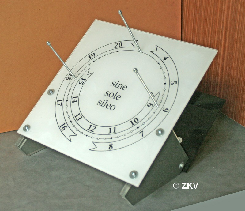 Dit is een equatoriale zonnewijzer met drie poolstijlen. De afleespunten en de poolstijlen staan op een cirkel. Een poolstijl staat bovenaan en de twee andere staan links en rechts tegenover 6 u en 18 u. De uren zijn aangegeven op drie linten die telkens de schaduw opvangen van de tegenover gelegen poolstijl. Doordat het tafereel uitgevoerd is uit eenzijdig gesableerd Perspex en de poolstijlen achteraan doorlopen geeft deze zonnewijzer de tijd aan over gans het jaar en gedurende de hele klare dag.