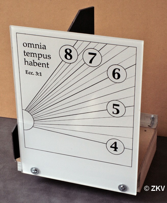 | Dit is een avondzonnewijzer bestemd voor een appartement langs de Belgische kust. Deze is verwant met voorgaande model maar de schaduwgever vormt een hoek van 55° met het tafereel. Wanneer de zonnewijzer aan een raam geplaatst wordt en juist geörienteerd dan komt hij nagenoeg evewijdig et de voorgevel. |