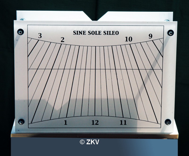 | De plaat achteraan heeft in het midden bovenaan een driehoekige inkeping. De top ervan toont op de plaat vooraan de zonnetijd en het seizoen. |