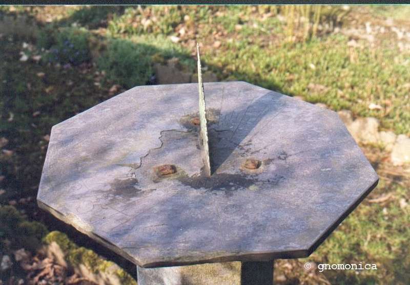 De wijzerplaat van deze oude leistenen zonnewijzer is niet meer leesbaar, maar de poolstijl is intact.