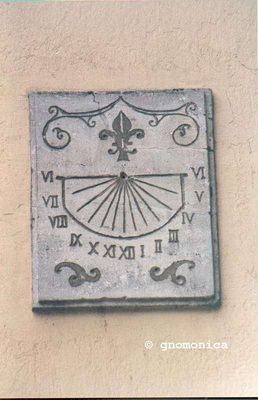 Op de gevel van een antiquariaat. Deze zuidwijzer ziet er zeer oud uit, maar staat hier slecht georiënteerd.