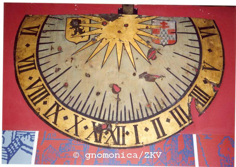 Het is de zonnewijzer van de oorspronkelijke Lakenhalle die tijdens de Eerste Wereldoorlog (1914-1918) vrijwel volledig verwoest werd. Het fraaie metalen tafereel zit dan ook vol kogelgaten en andere beschadigingen.