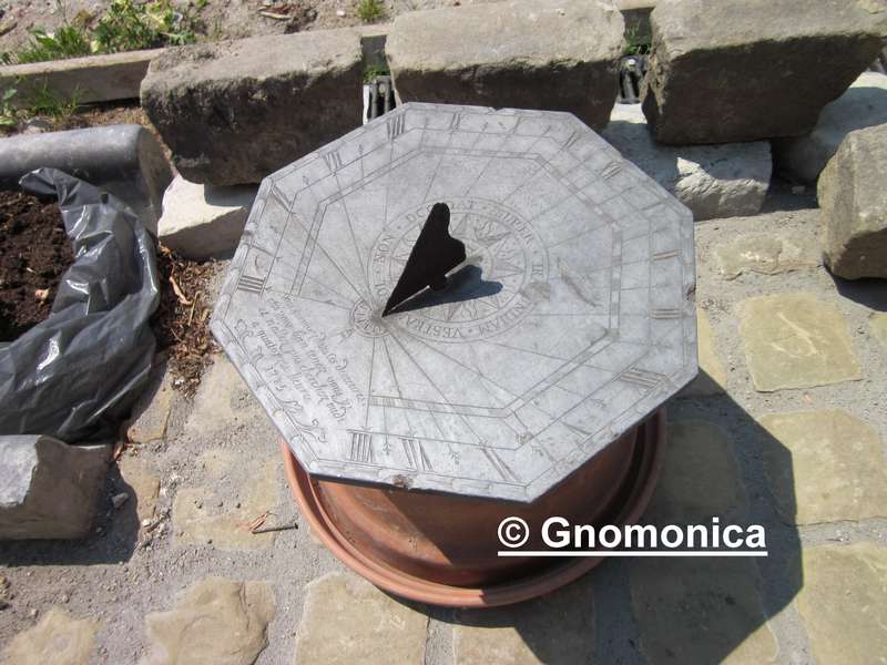 Tekst: 'Vous qui vivez dans ces demeures, etes vous bien tenez vous y, et n'allez pas chercher midi a quatorzes heure' (zo geschreven)