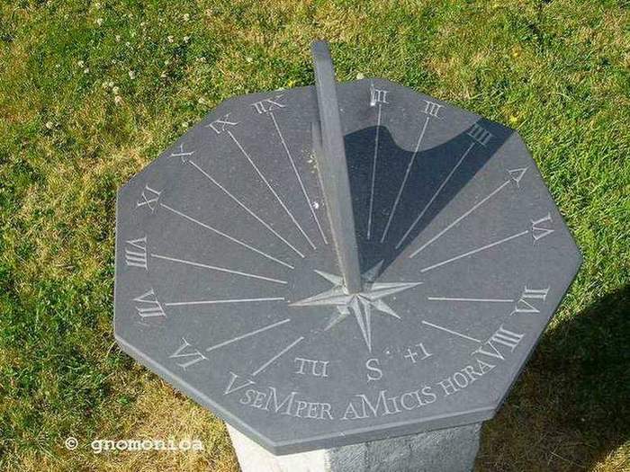 Ce cadran horizontal de forme octogonale a été grâvé à la main dans de la pierre bleue originaire de Stonehenge. Ses dimensions sont de 38,2 cm x 38,2 cm ce qui correspond à 15 pouces pour une hauteur de 2 cm.